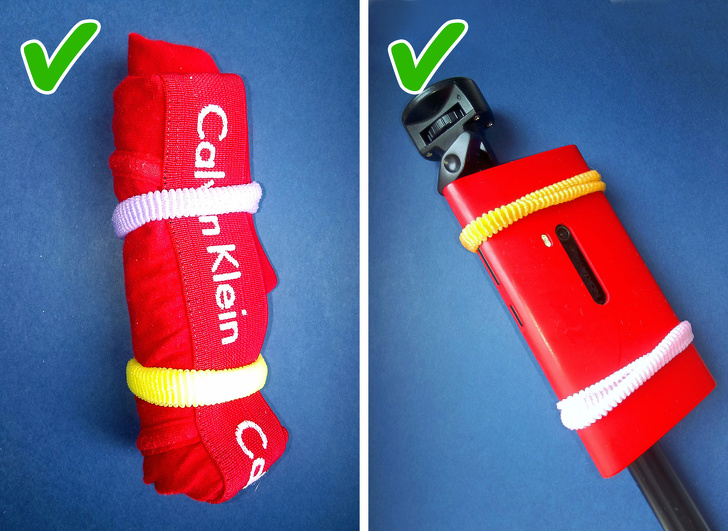 Dây buộc tóc cũng hữu ích như băng keo vậy. Bạn có thể sử dụng nó để gói ghém và cuộn quần áo của bạn thật chặt sao cho nó không chiếm quá nhiều không gian vali hay túi xách. Bạn cũng có thể dùng nó để sửa nhiều thứ khác nhau như: ghim chiếc smartphone vào cây gậy tự sướng trong trường hợp phần giá dùng để giữ smartphone trên cây gậy bị gãy.