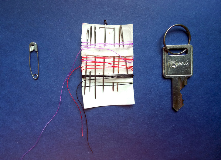 Lấy vài cây kim, đâm chúng xuyên qua một tấm bìa các tông, rồi quấn chỉ xung qanh (hãy chắc chắn rằng màu của sợi chỉ này hợp với màu quần áo mà bạn mang theo). Thứ nhất, đi này sẽ giúp bạn sửa lại các bộ quần áo yêu thích. Thứ hai, bạn có thể sử dụng cây kim để gảy mảnh vụn ra khỏi vết thương (đừng quên khử trùng kim bằng cồn hoặc bằng lửa nhỏ).