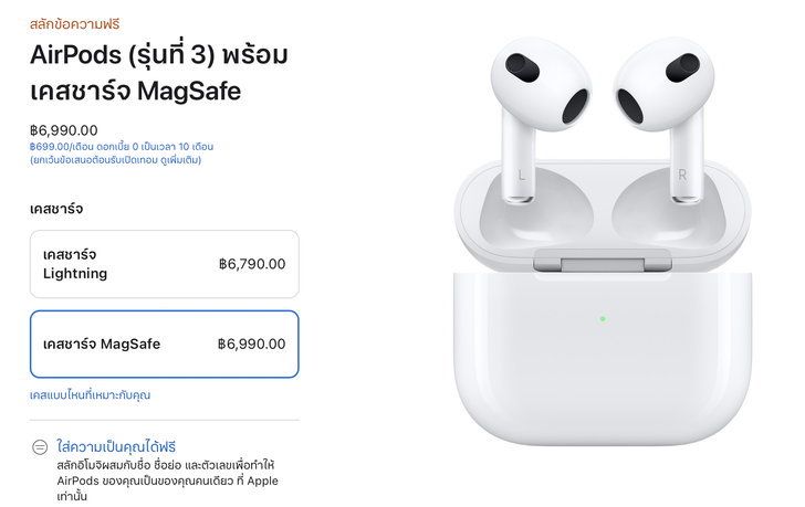 AirPods 3 với Hộp sạc chỉ Lightning Giá bán là 6.790 baht, trong khi hộp đựng AirPods 3 hỗ trợ sạc không dây và MagSafe, giá 6.990 baht .. chênh lệch 200 baht với mức giá này. Không khó để quyết định lấy cái nào.