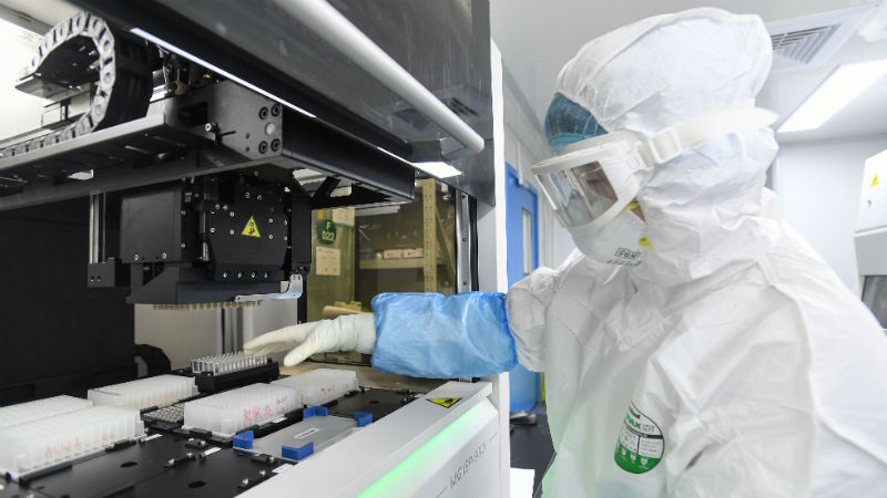 Một kỹ thuật viên phòng thí nghiệm làm việc với các mẫu từ những người được xét nghiệm virus corona tại Vũ Hán. (Ảnh: Getty Images)