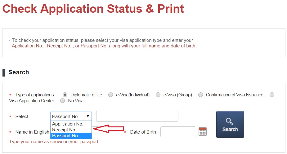 - Số hộ chiếu (Passport No.); hoặc Số hóa đơn mua (Receipt No.); hoặc Số hồ sơ (Application No.) Điền số gì thì chọn mục tương tự nhé, để đơn giản thì các bạn cứ chọn kiểm tra thông tin bằng hộ chiếu rồi nhập số vào cho tiện, khỏi phải kiếm lại tờ hóa đơn hay giấy hẹn.