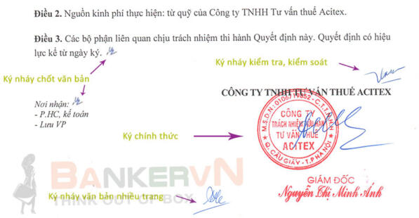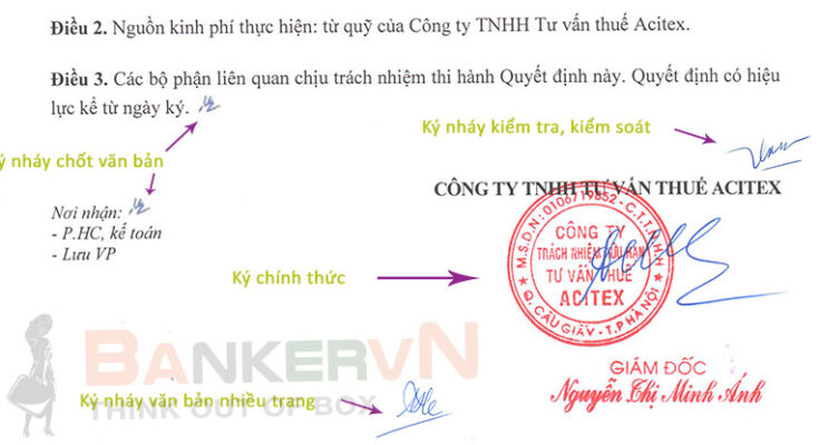 - Một quyết định về mặt hành chính của doanh nghiệp. Nhân viên hành chính soạn thảo văn bản ký ở dòng nội dung cuối cùng. Trưởng phòng hành chính kiểm tra lại văn bản và ký nháy ở phần chức danh của người ký chính thức. Người có thẩm quyền ký chính thức vào văn bản. Văn thư lấy số văn bản, đóng dấu lên chữ ký chính thức, đóng dấu giáp lai nếu văn bản có nhiều trang và ban hành văn bản. Như vậy khi nhìn vào văn bản sẽ biết được ai soạn thảo, ai kiểm tra và ai ký cuối cùng. Các chữ ký thể hiện trách nhiệm của toàn bộ những người liên quan khi ban hành văn bản.