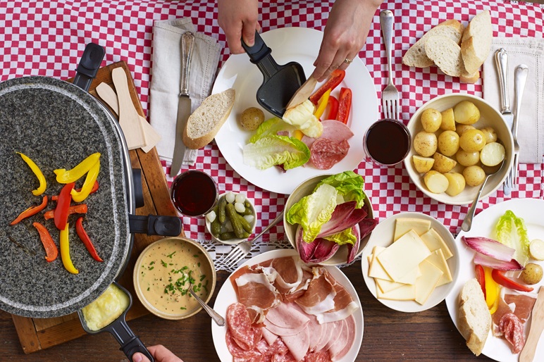 - Raclette: Món phô mai tan chảy khác cũng nổi tiếng không kém. Phô mai raclette được nung chảy và rưới trực tiếp lên khoai tây luộc, dưa leo muối, hành ngâm và thịt nguội. Đây là món ăn đặc trưng vùng núi và rất được yêu thích vào mùa lạnh.