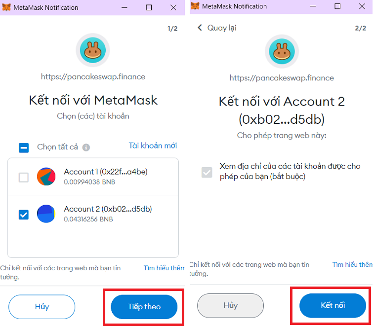 Trên tiện ích Metamask, chọn ví kết nối và đồng ý Kết nối