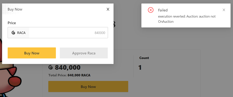 Nếu không có lỗi thì sẽ mua được Metamon. Trong ví Metamask, tiền sẽ bị trừ và nhận lại NFT Metamon. Bên dưới mình gặp lỗi không mua được. Failed: execution reverted Auction: auction not OnAuction. Đây là lỗi do hàng không còn, đã có người mua. Một lỗi thường xuyên gặp.