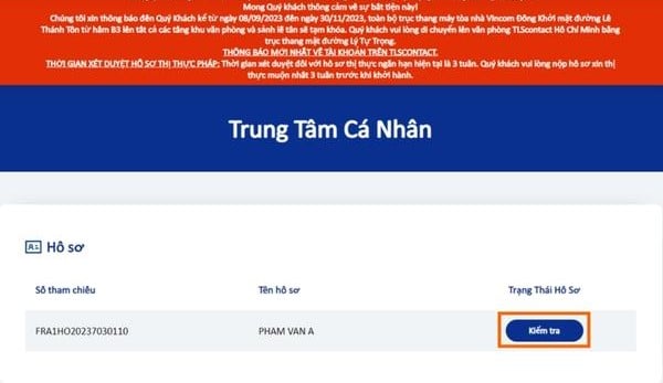 Đây là danh sách các hồ sơ khách hàng đã điền đơn và đặt lịch hẹn. Bạn nhấn vào “Kiểm tra” ở những hồ sơ mà cần tra cứu kết quả visa Pháp.