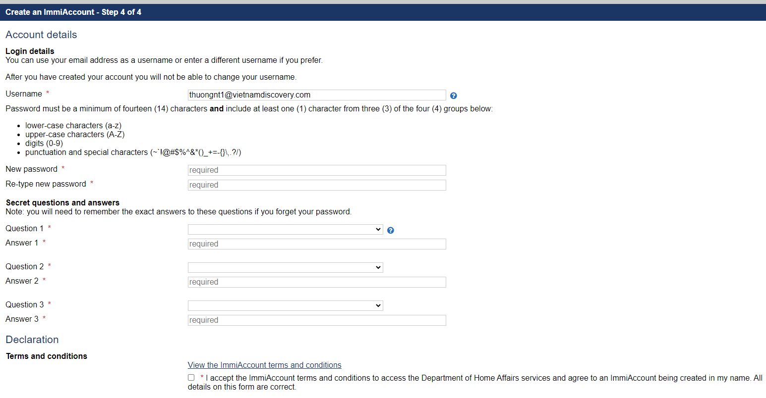 Click vào I accept the ImmiAccount terms and conditions to access the Department of Home Affairs services and agree to an ImmiAccount being created in my name. All details on this form are correct và I am not a robot và submit.