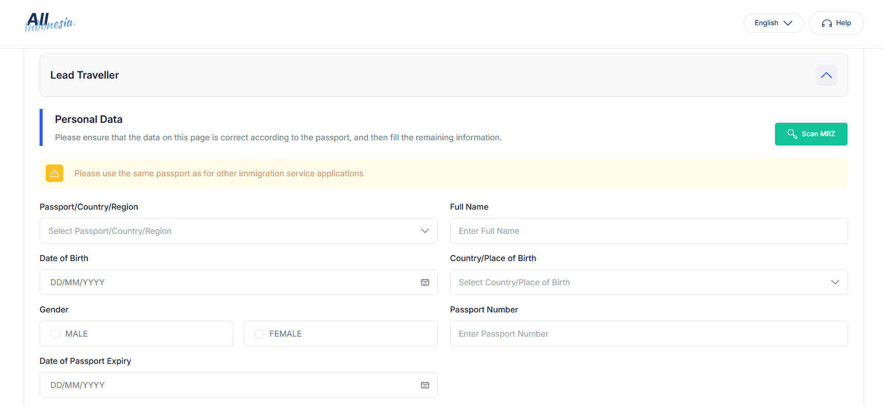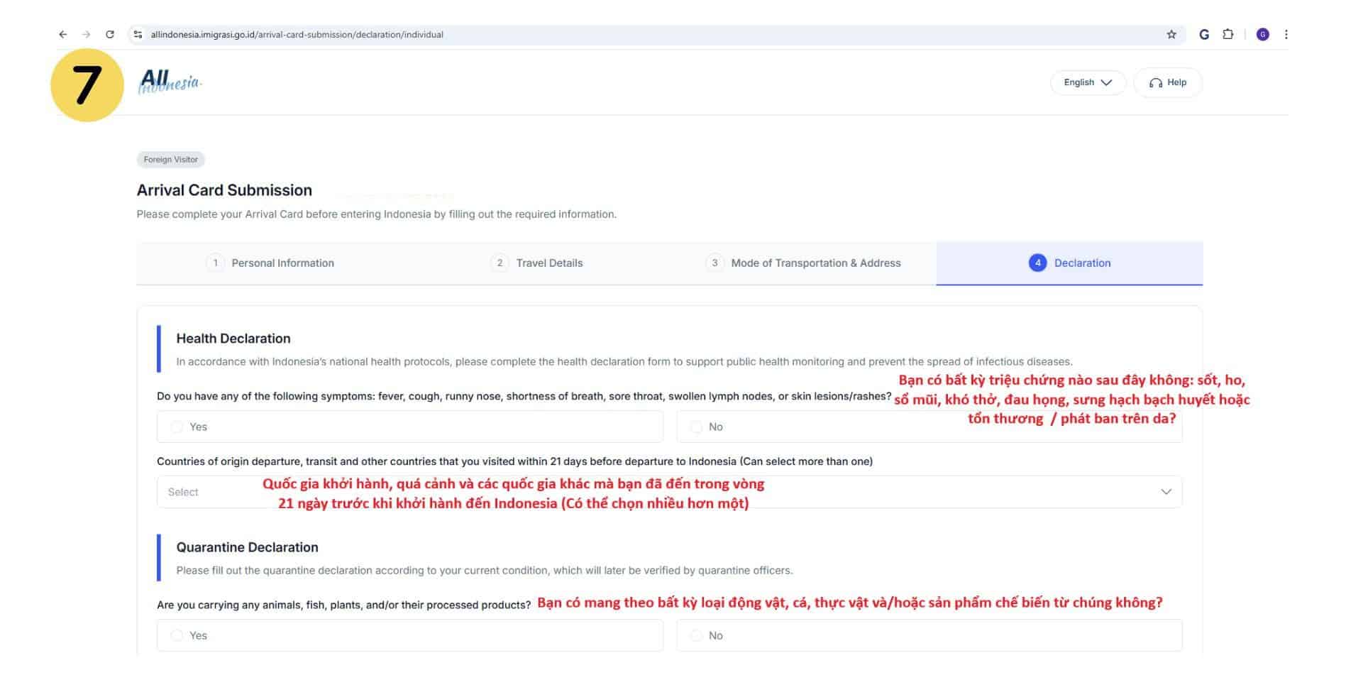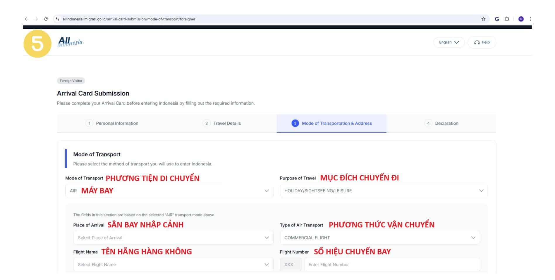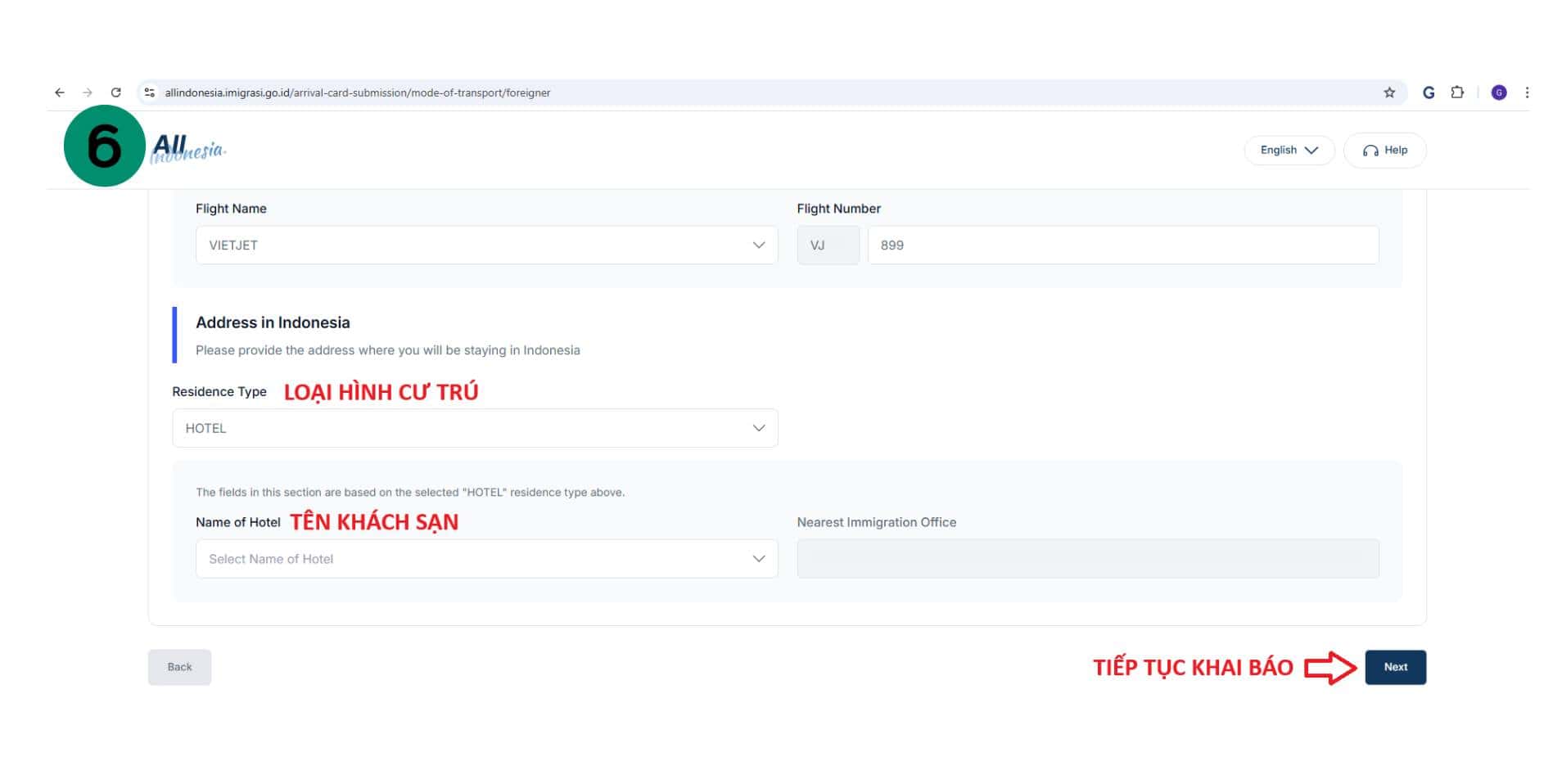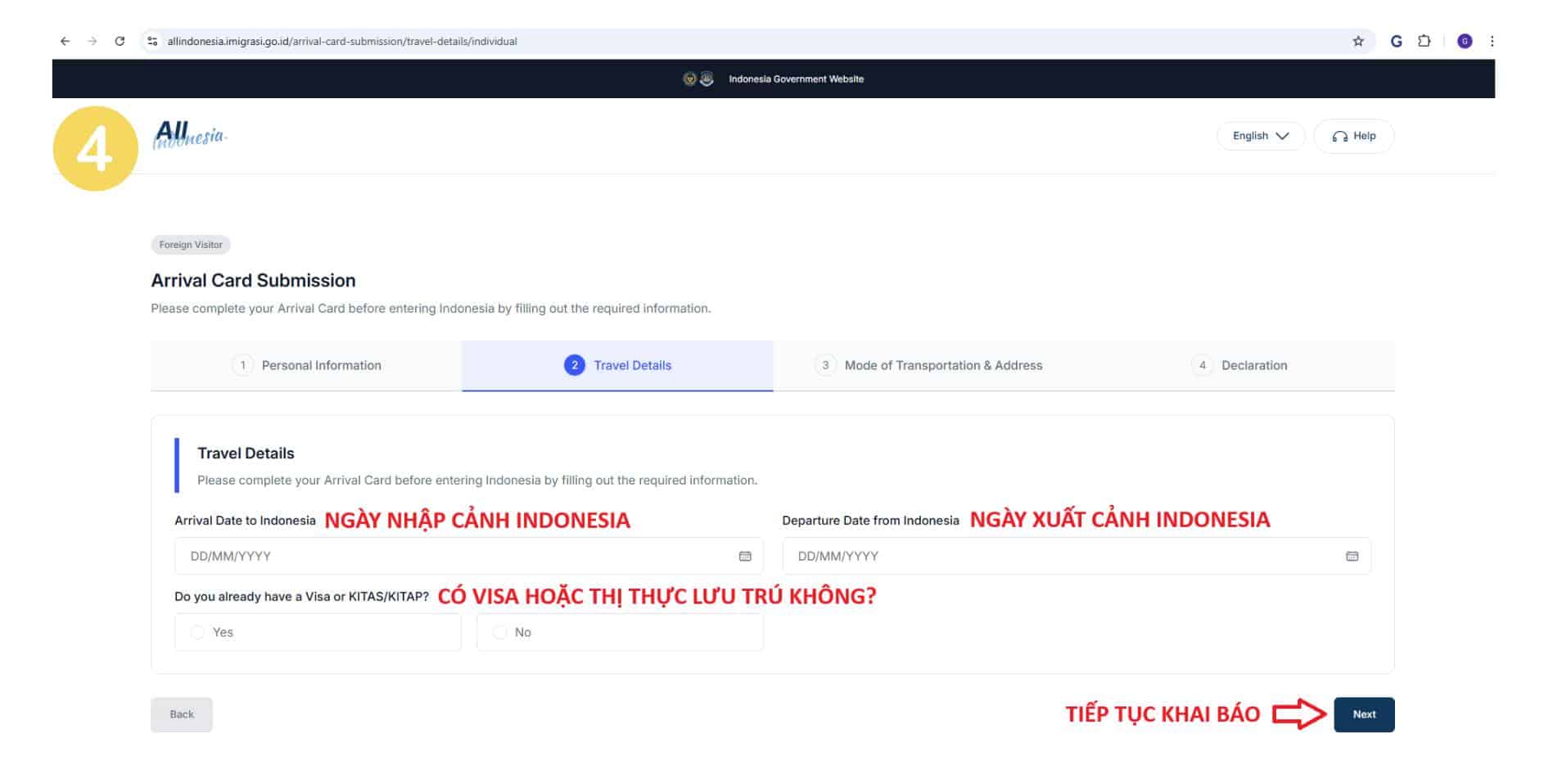 - Thông tin chuyến đi: số hiệu chuyến bay, ngày nhập cảnh, nơi ở tại Indonesia.