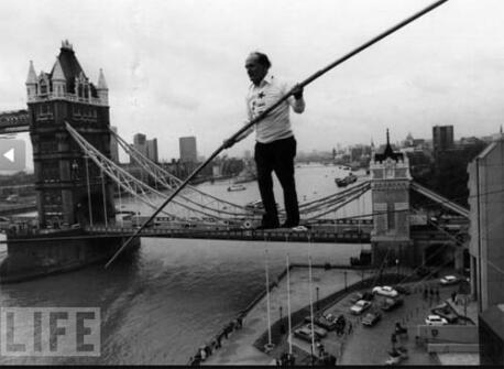 Bắt đầu luyện tập môn thể thao này từ năm 6 tuổi, Karl được xem như một trong những nghệ sĩ đi trên dây nổi tiếng nhất trong lịch sử. Anh thường xuyên biểu diễn cùng các thành viên trong gia đình. Trong ảnh là khi anh thực hiện màn trình diễn tại London năm 1976 đi trên cây cầu nổi tiếng Tower Bridge. “Cuộc sống chính là trên những sợi dây” – anh chia sẻ.