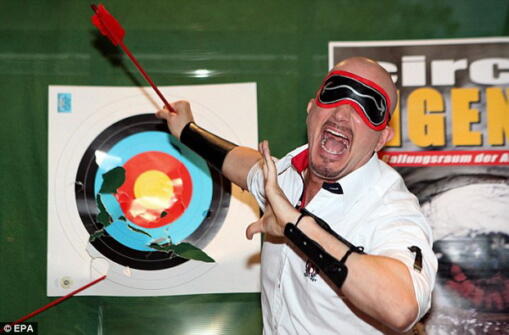 Ông Joe Alexander bịt mắt và bắt được 4 mũi tên trong 2 phút ở Hamburg, Đức.