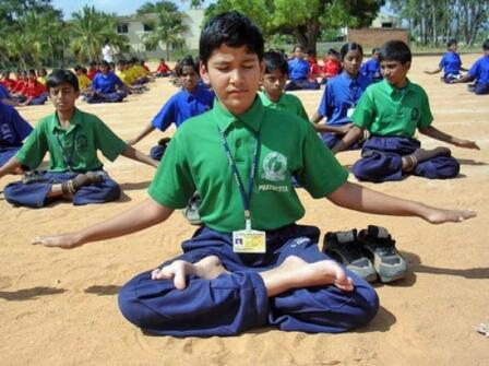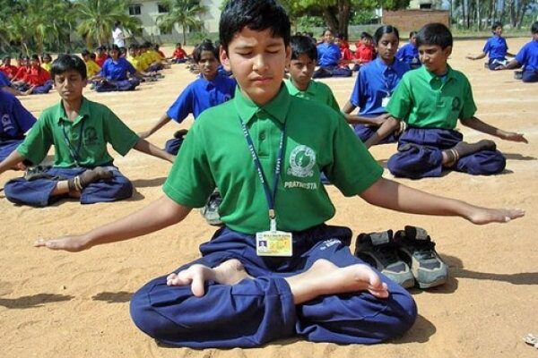 Học sinh Ấn Độ đang tập bài công pháp thứ 1 của Pháp Luân Công. (Ảnh: Internet)