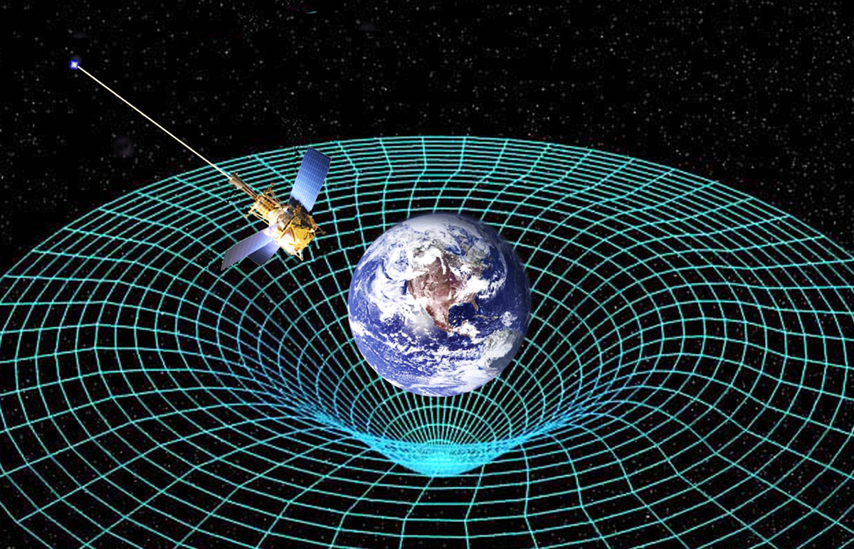 Sơ đồ về độ cong của thời không trong phạm vi Trái đất. Trạng thái thời không của vệ tinh nhân tạo sau khi bay ra khỏi khí quyển hoàn toàn khác với trạng thái thời không trên mặt đất. (Ảnh: NASA)