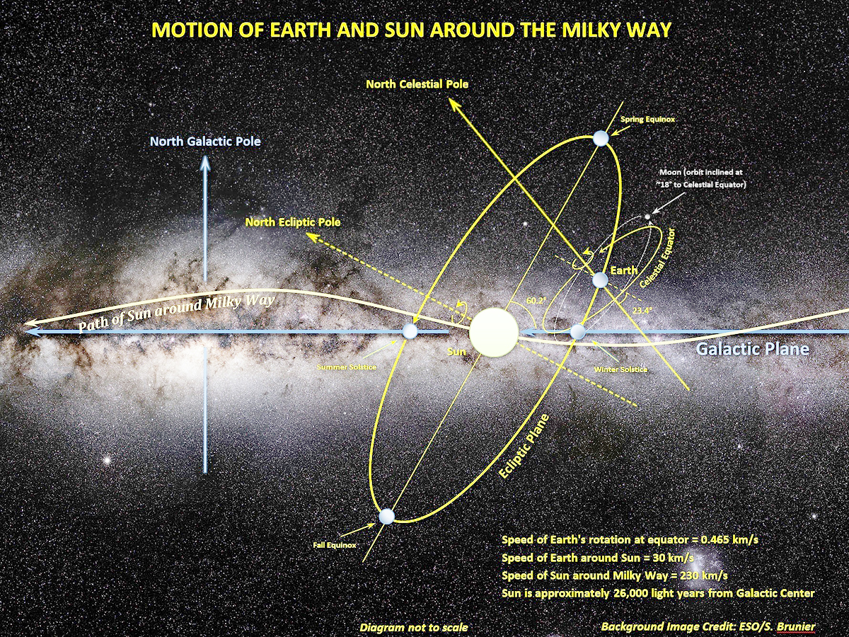 Nếu xem hệ Ngân hà như một đĩa phẳng lớn, vậy góc giữa đĩa nhỏ hệ Mặt trời và đĩa lớn hệ Ngân hà khoảng 60 độ, trong môi trường này, hệ Mặt trời đứng thẳng tựa như một cái quạt điện chuyển động thẳng về phía trước. Nói cách khác, từ góc độ này, Trái đất sẽ chuyển động nghiêng quanh Mặt trời. Và Mặt trời bởi vì tiến rất nhanh, cho nên quỹ đạo các hành tinh trong hệ Mặt trời thực ra không phải là chuyển động của những vòng tròn khép kín, mà đuổi theo Mặt trời ở dạng hình xoắn ốc.