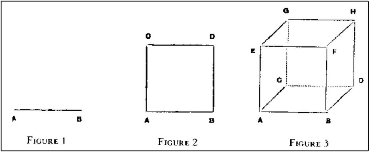 Sơ đồ biểu thị không gian một chiều, hai chiều, ba chiều. Theo cách hiểu thông thường, đường thẳng là một chiều, bề mặt là hai chiều, thể tích là ba chiều. (Ảnh: Alamy)